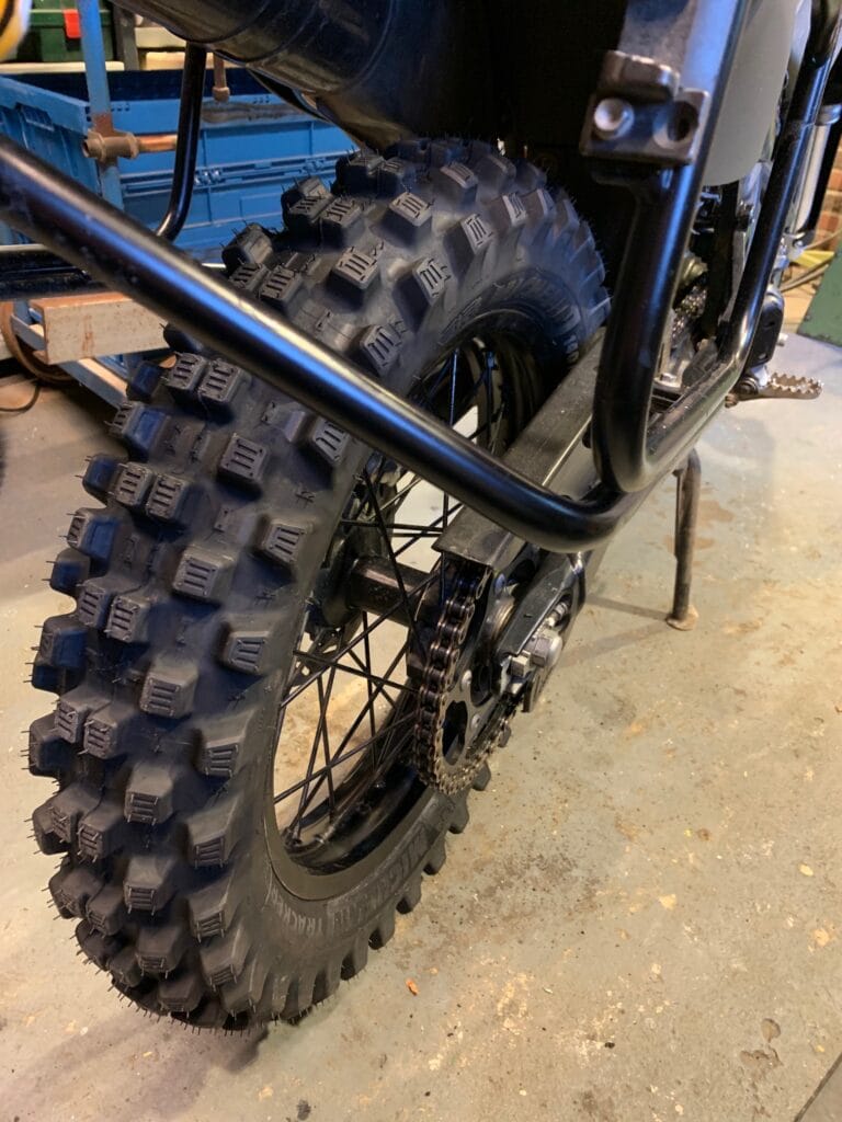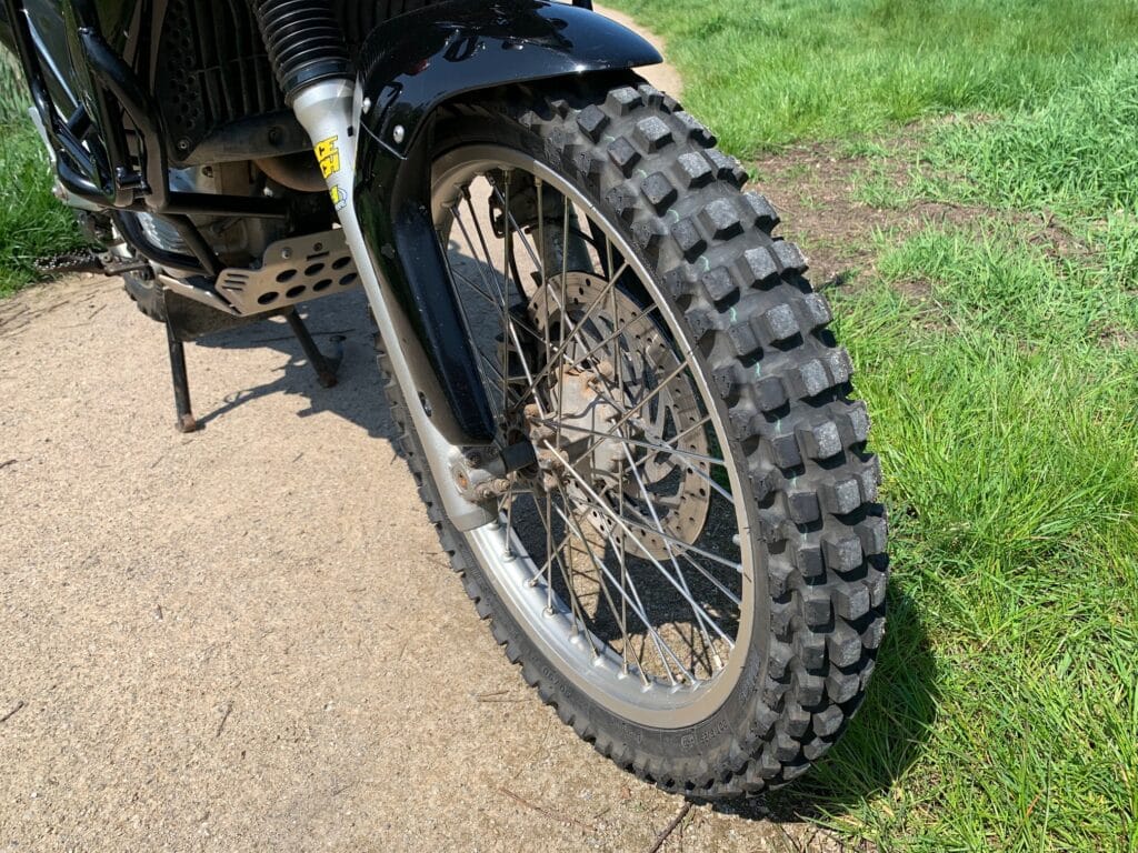 Michelin Tracker* (TT) 10/90(straatlegale noppenband), veel grip off-road en voorspelbaar op asfalt. Fijne band, wel een lange (-re) remweg!